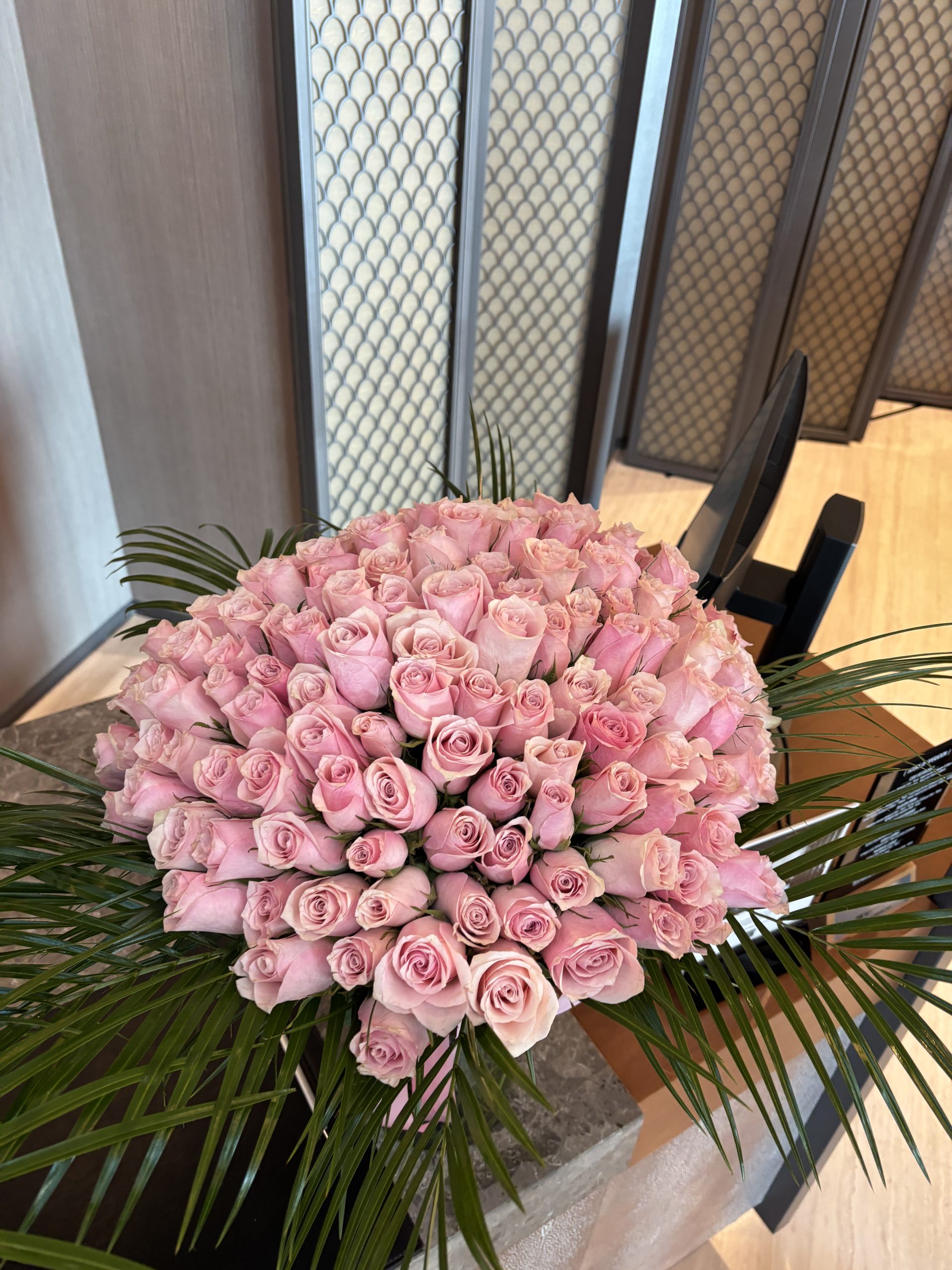 151 exquisite Pink Roses have been meticulously arranged with specially selected foliage to create a breathtaking display of beauty and sophistication. Carefully placed in a sleek cylinder vase, this stunning arrangement is designed to add a touch of elegance to your most memorable and cherished occasions. Whether celebrating love, joy, or any special moment, this timeless design promises to leave a lasting impression.
