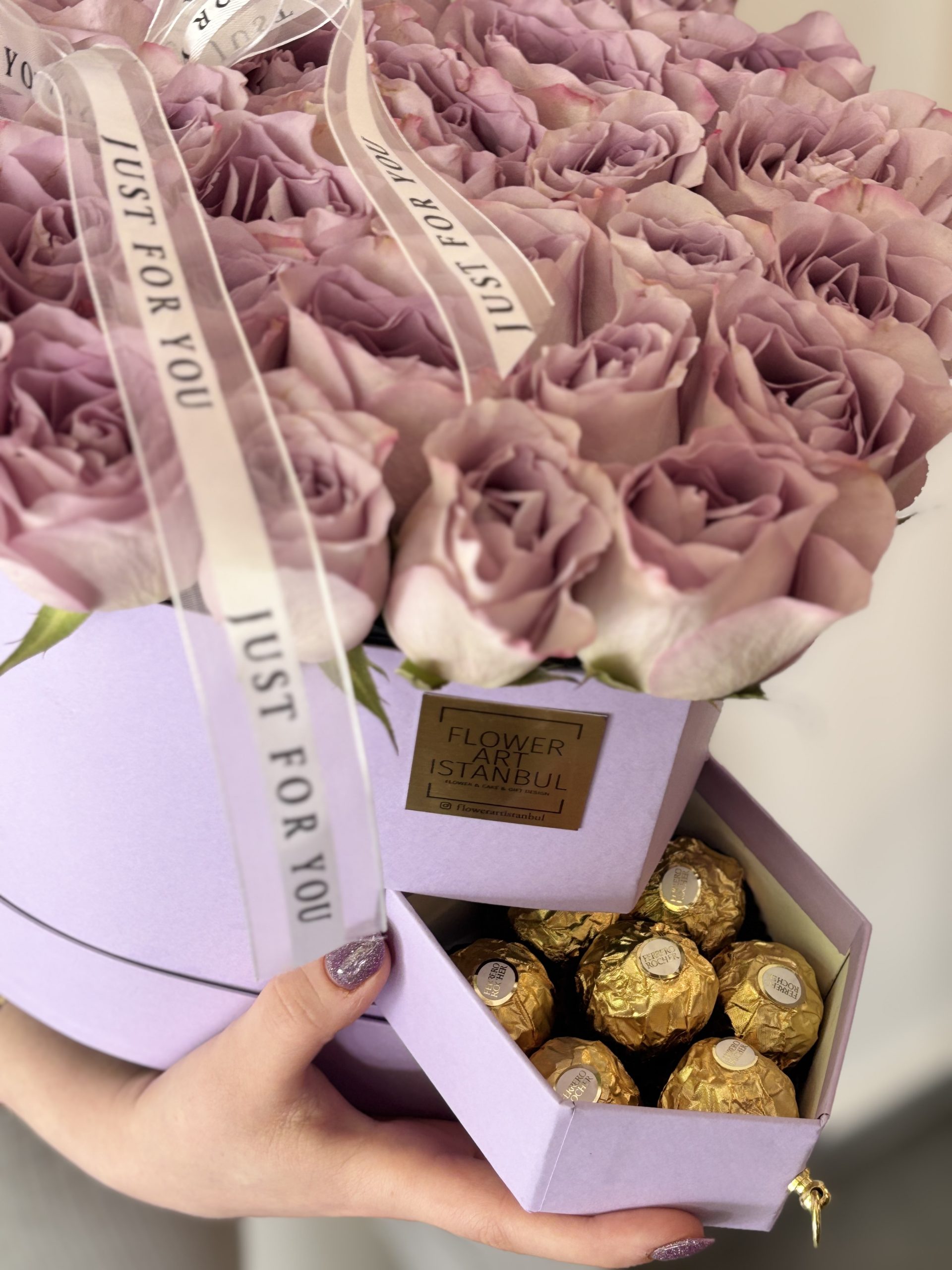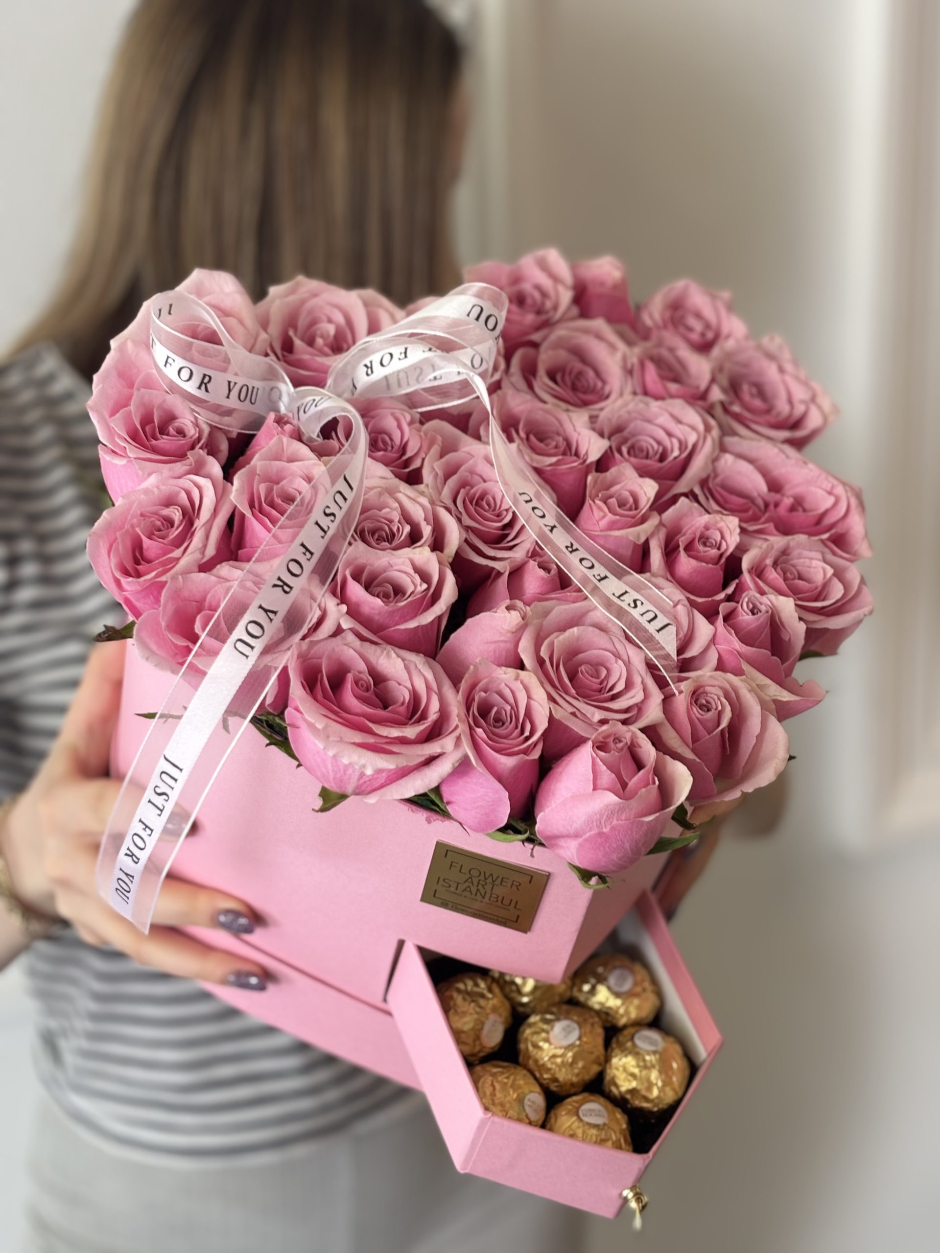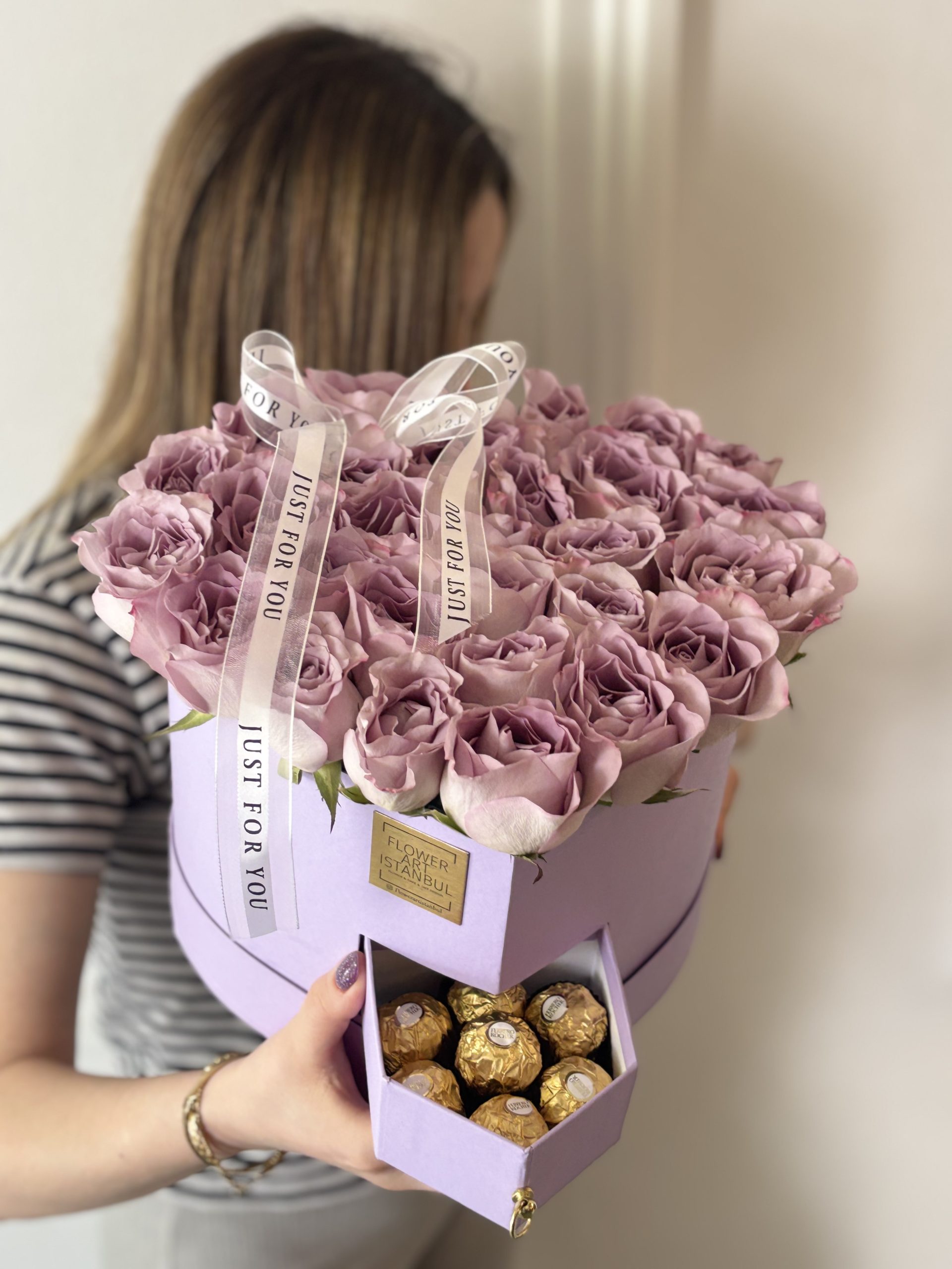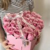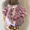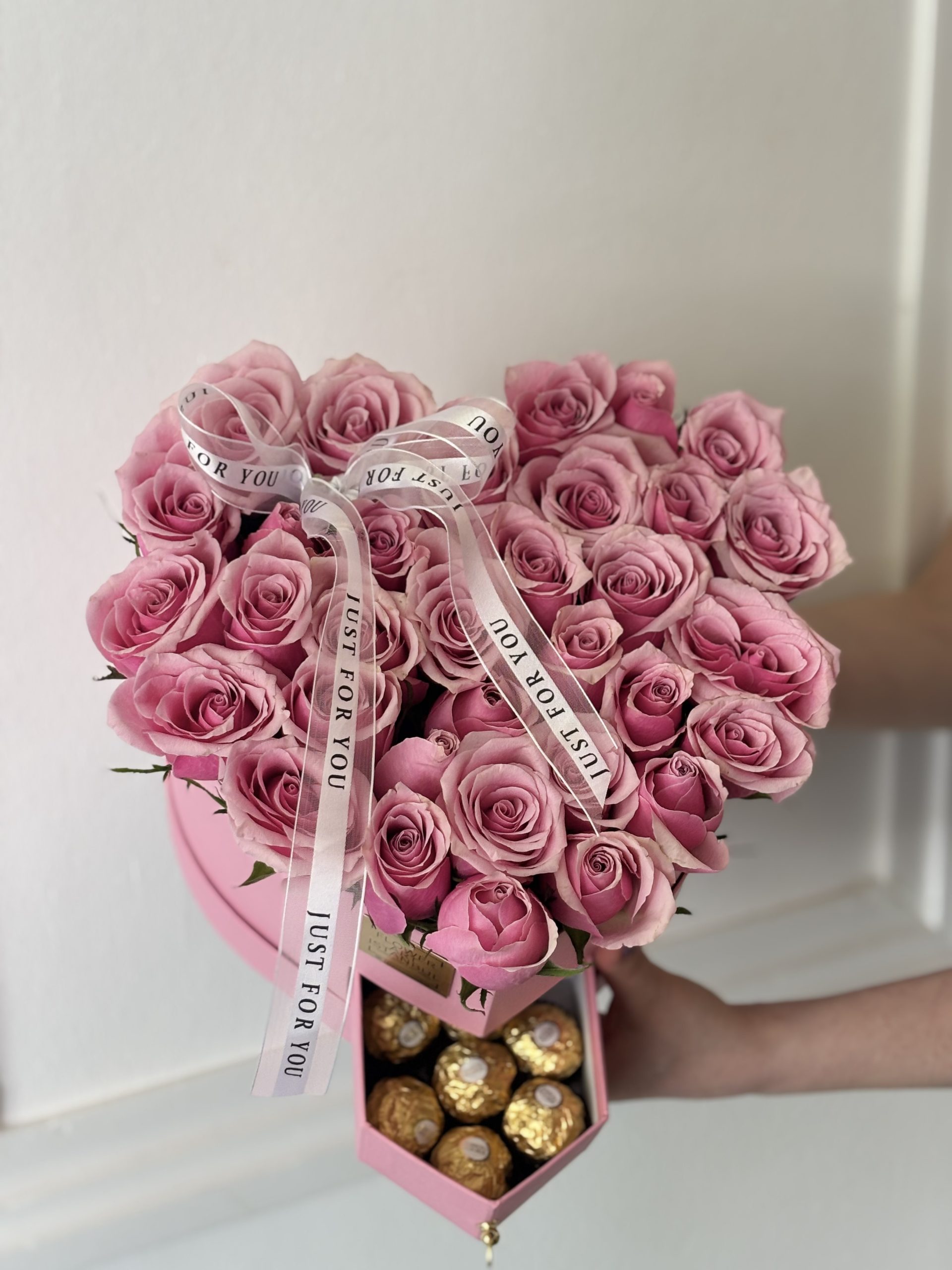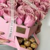 Carefully arranged with 6 Ferrero Rocher chocolates in a heart-shaped box, featuring 31 to 33 of the most exquisite roses. Inside the box, a special water-absorbing sponge with nourishing water keeps the roses fresh for an extended time—no vase needed.