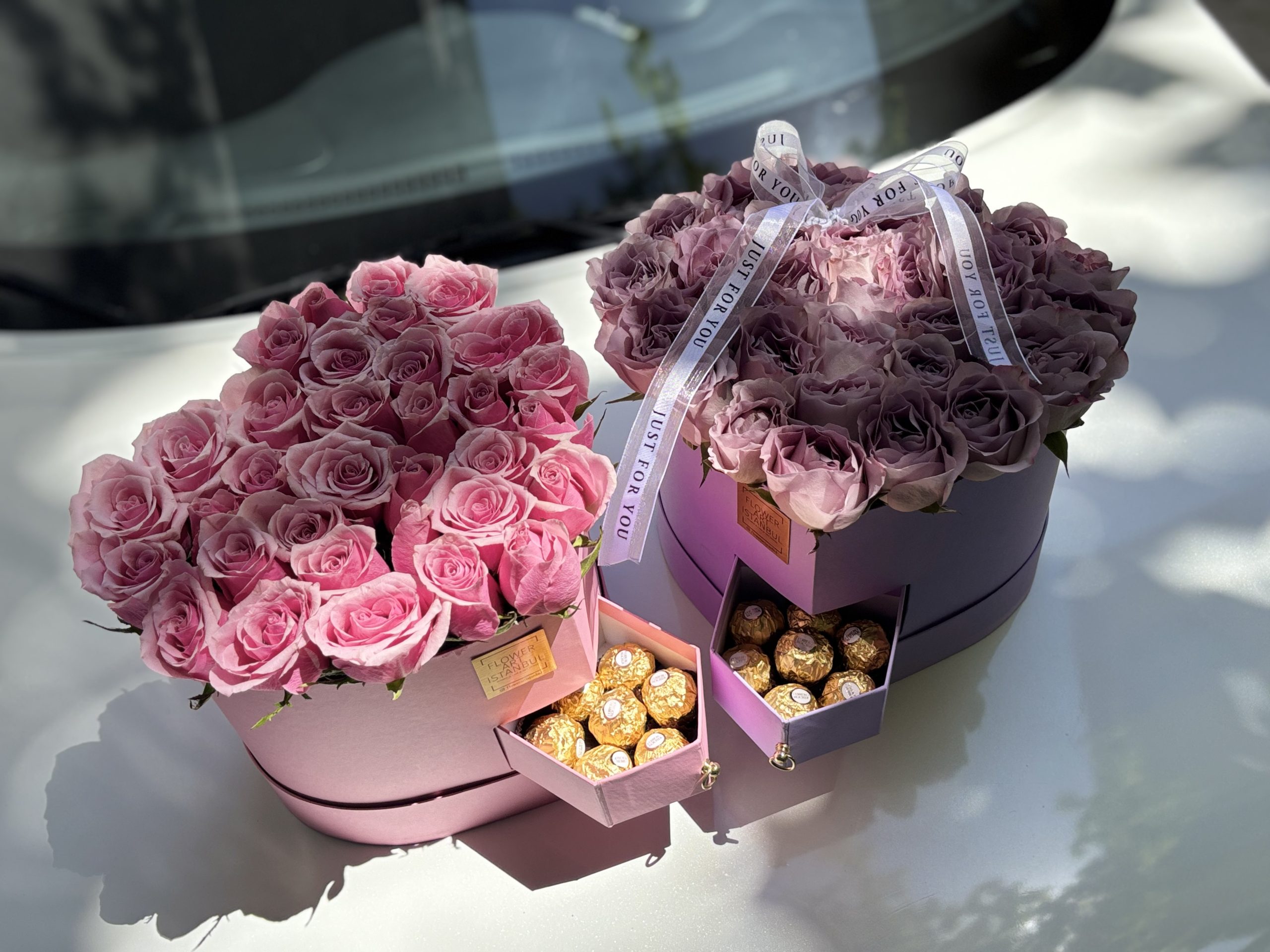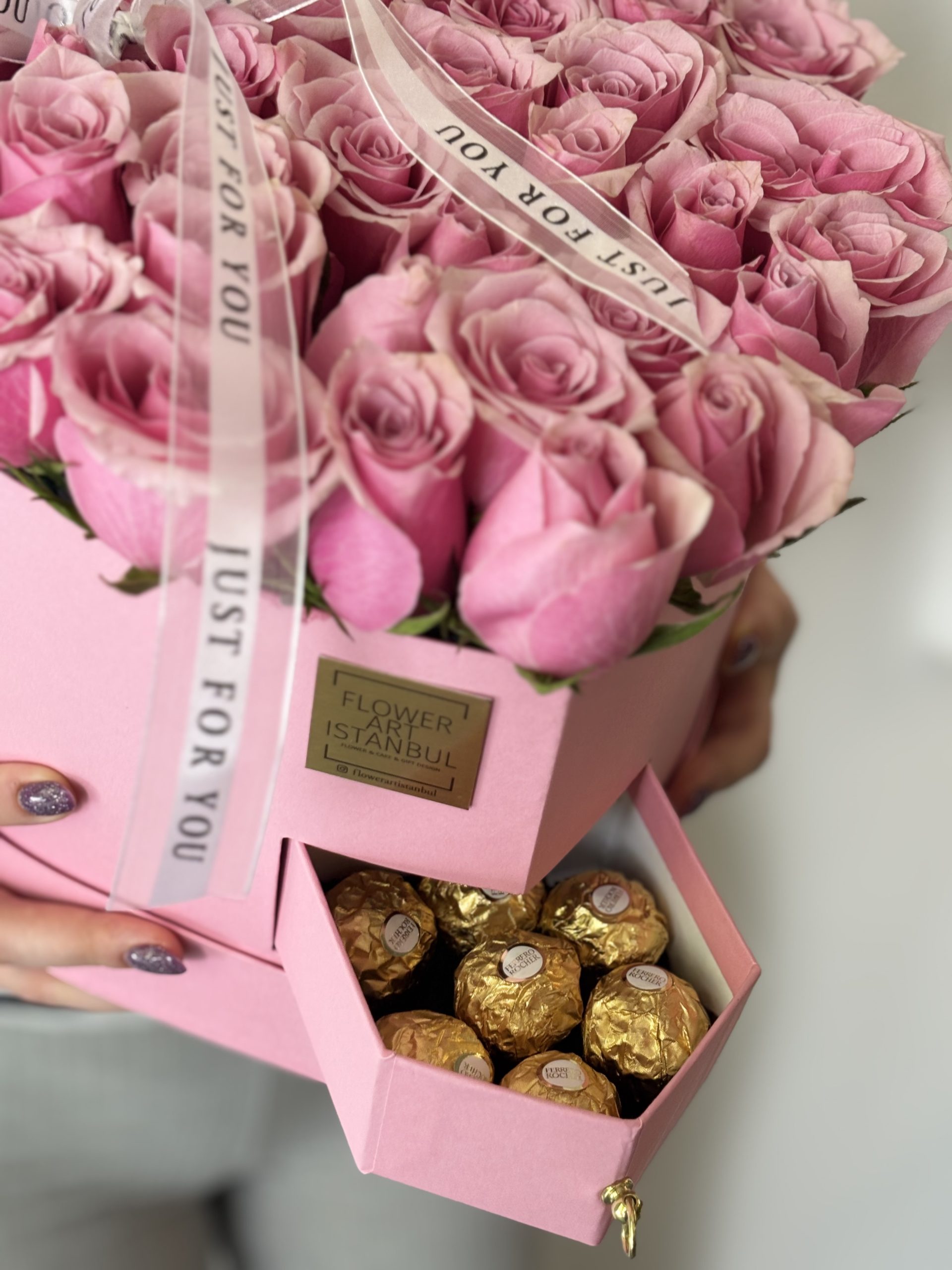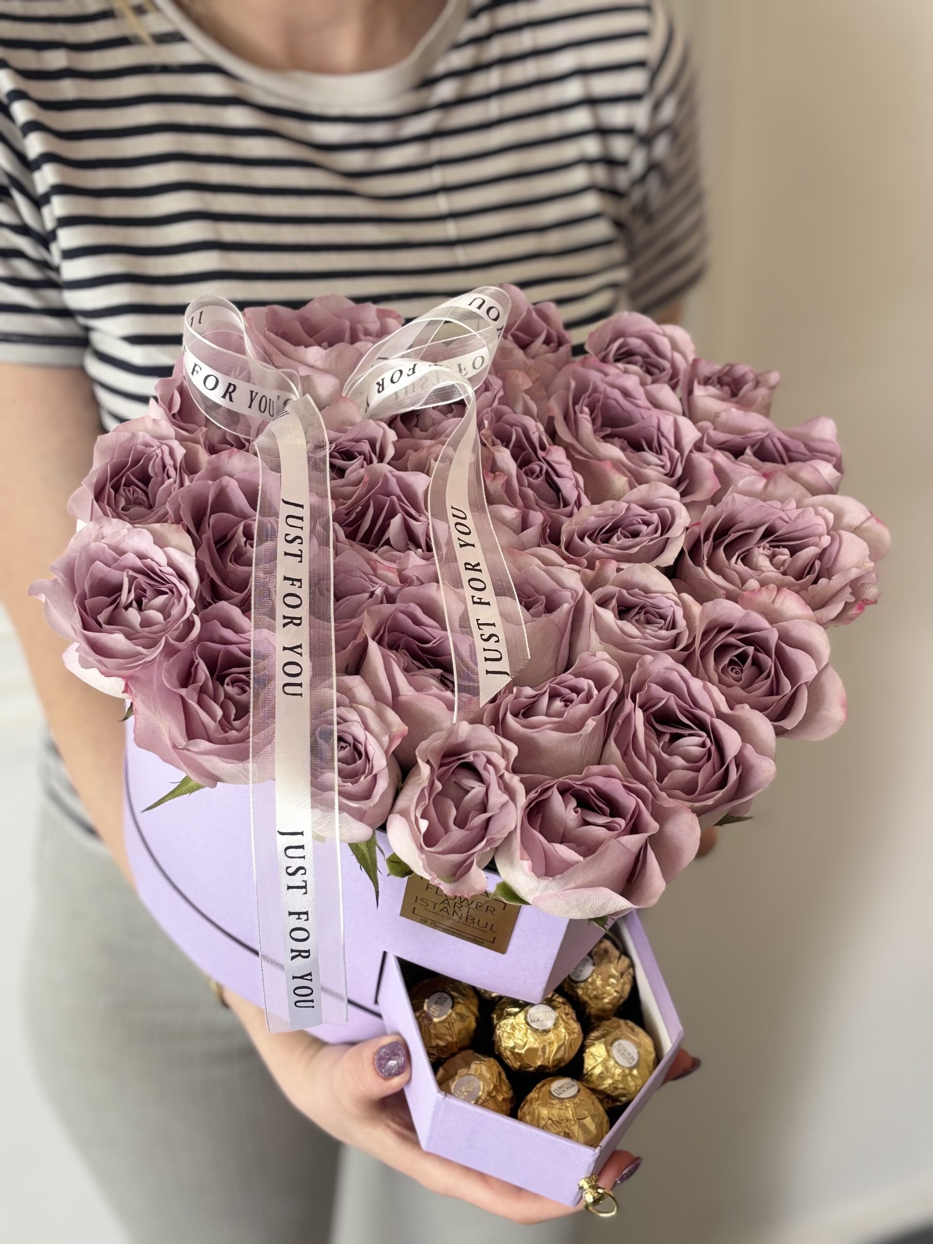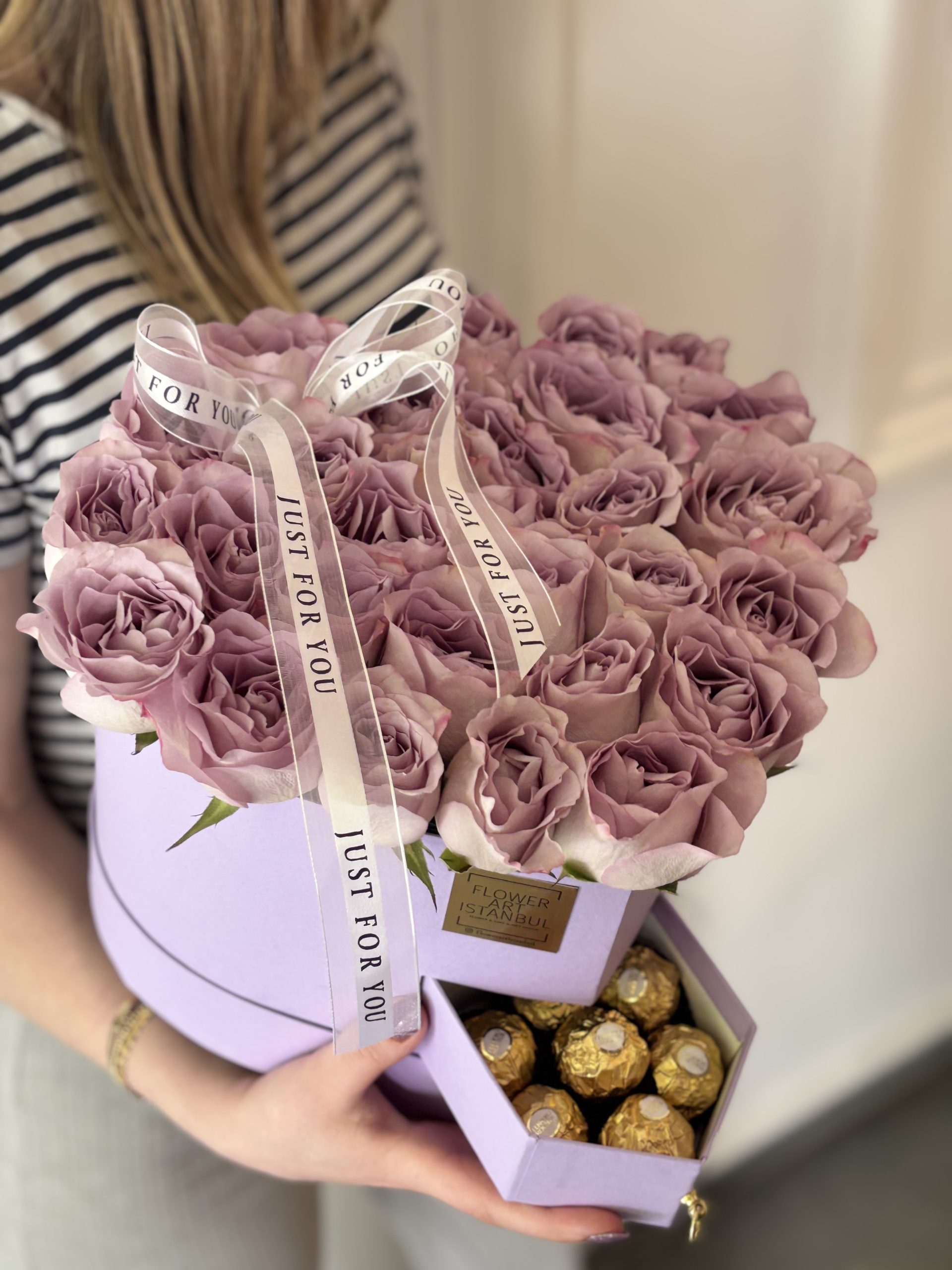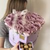 Carefully arranged with 6 Ferrero Rocher chocolates in a heart-shaped box, featuring 31 to 33 of the most exquisite roses. Inside the box, a special water-absorbing sponge with nourishing water keeps the roses fresh for an extended time—no vase needed.