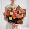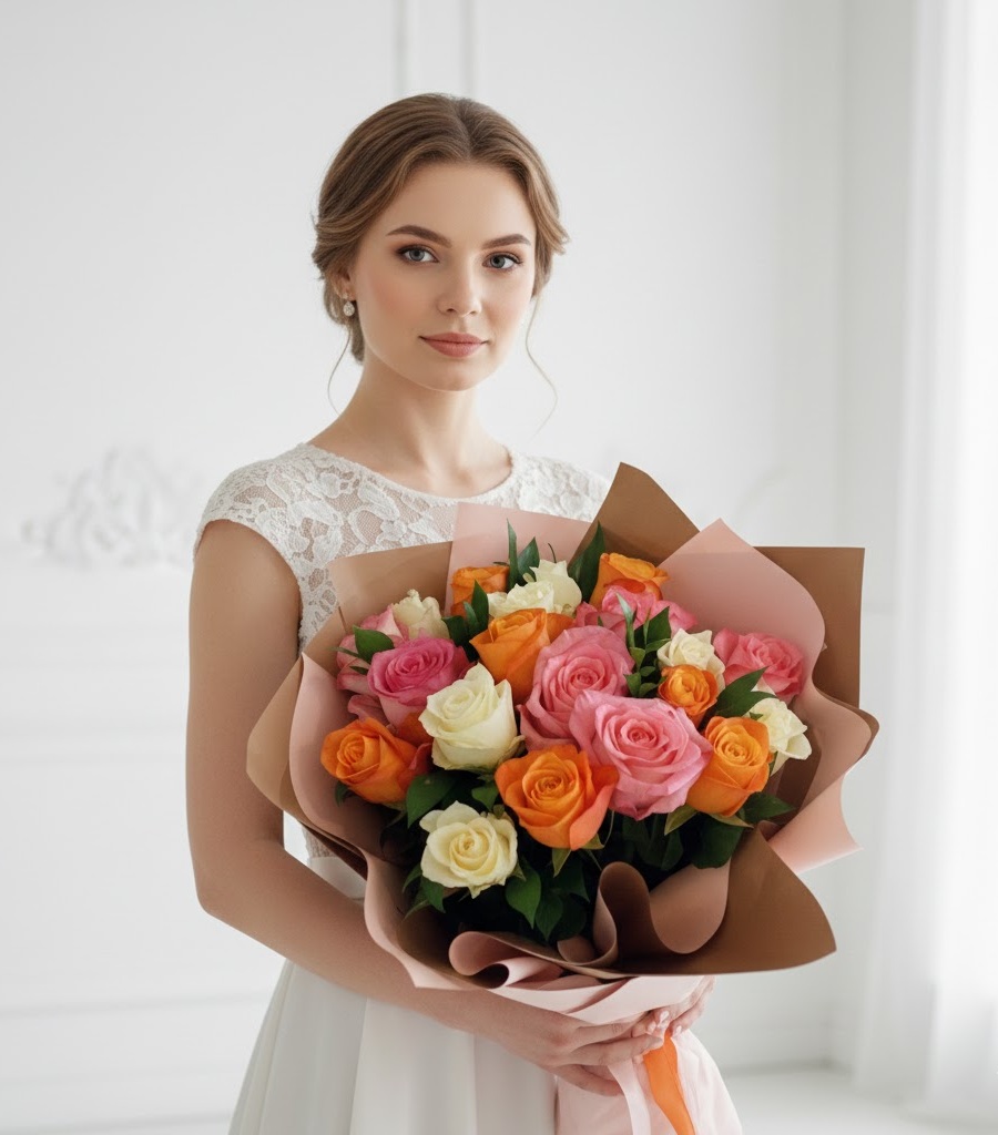 A vibrant and meticulously arranged bouquet featuring a harmonious mix of 11 orange roses, 11 pink roses, and 13 white roses. Each rose is carefully selected to create a stunning blend of colors, radiating elegance and charm. This beautifully crafted bouquet is perfect for bringing joy and warmth to any special occasion.