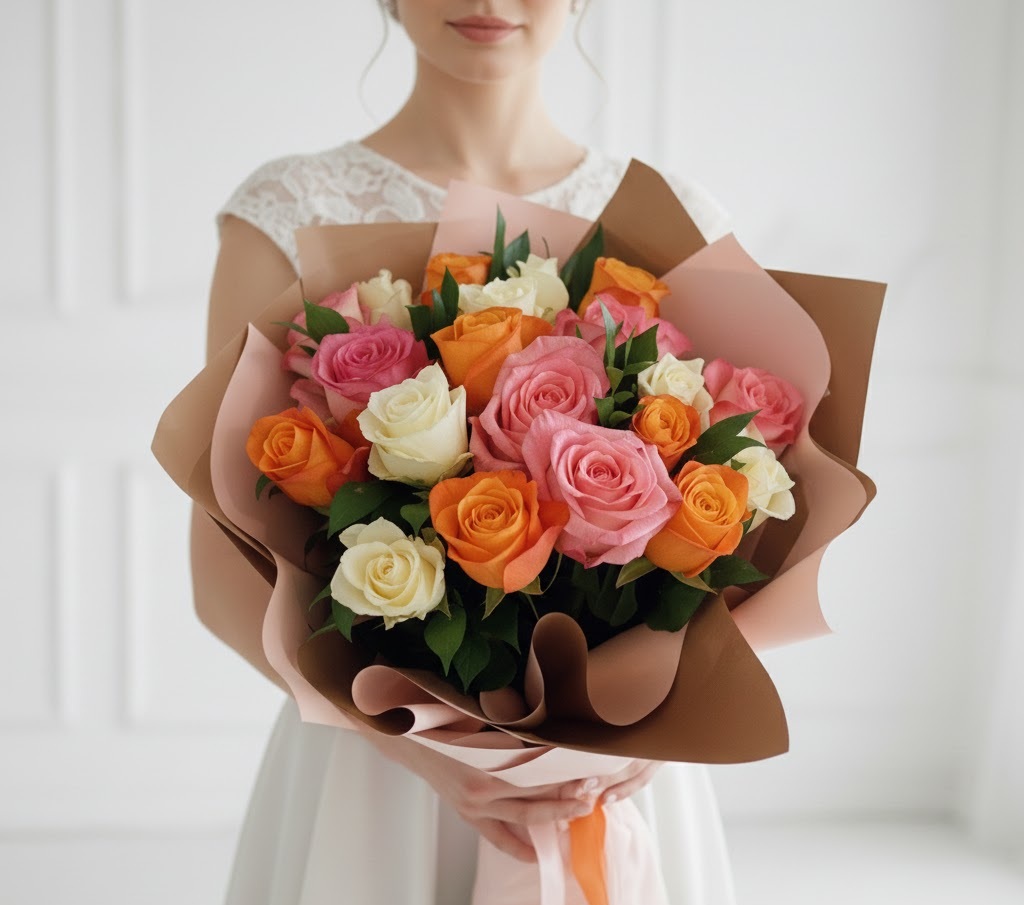 A vibrant and meticulously arranged bouquet featuring a harmonious mix of 7 orange roses, 7 pink roses, and 7 white roses. Each rose is carefully selected to create a stunning blend of colors, radiating elegance and charm. This beautifully crafted bouquet is perfect for bringing joy and warmth to any special occasion.