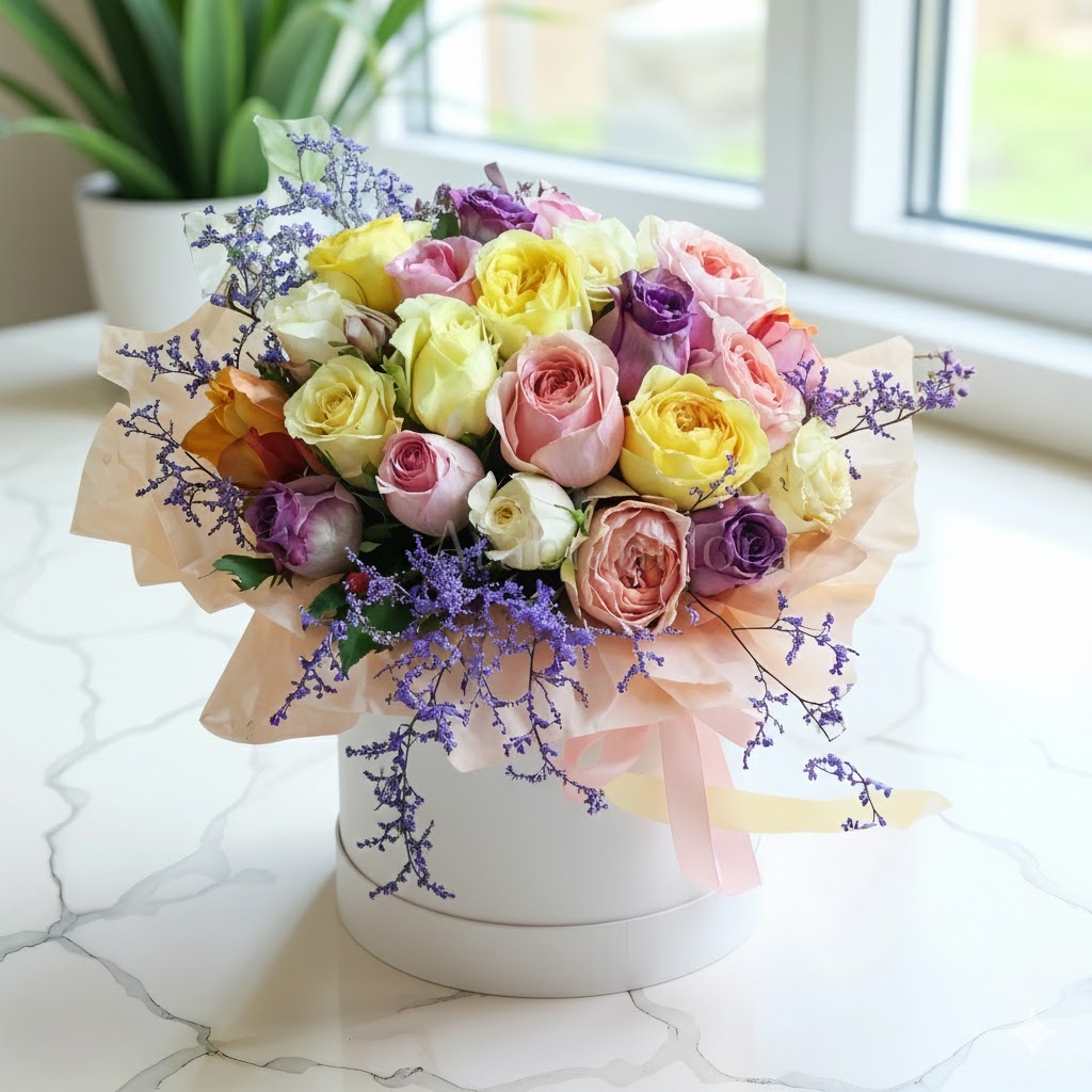 It has been carefully designed with the most exquisite 23-25 premium mix color roses. Inside the white velvet box, there is a special water-absorbing sponge and nourishing water, ensuring that your roses stay fresh for a long time without the need for a vase.