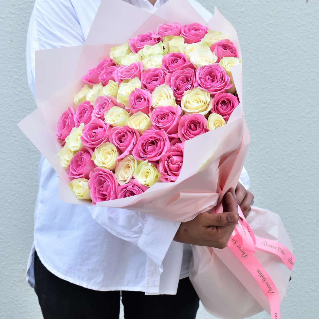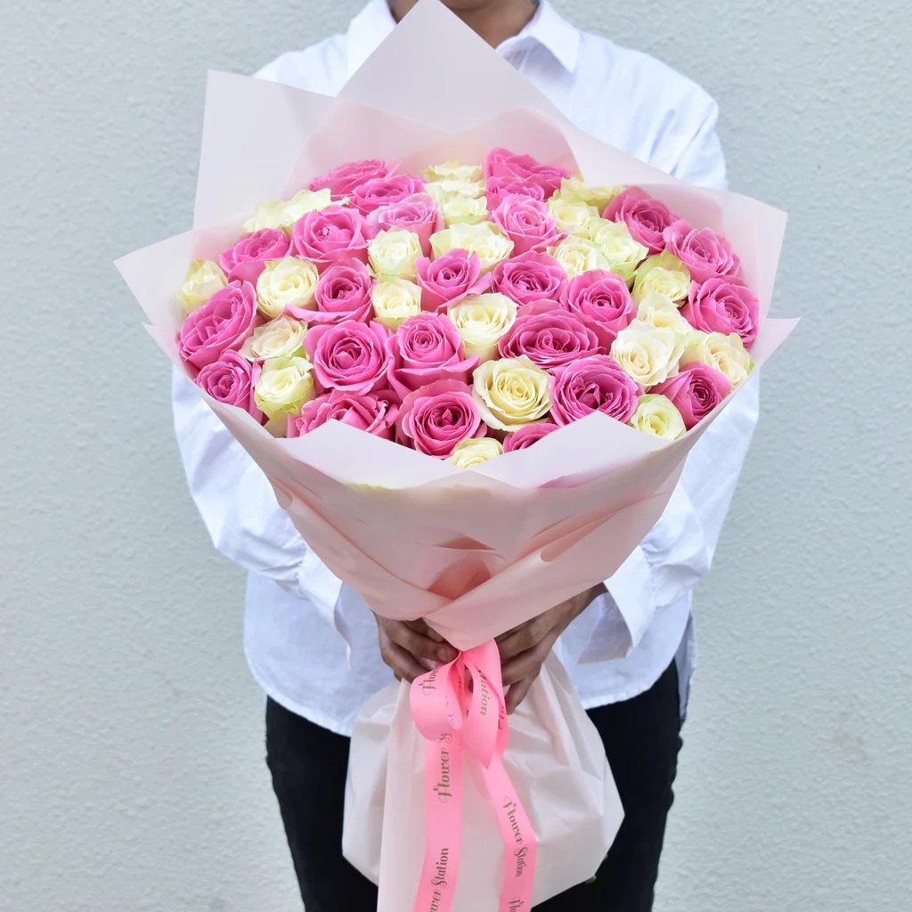 A delicately arranged bouquet featuring a beautiful blend of 25 pink roses and 26 white roses. Each bloom is carefully selected and artfully combined to create a charming and elegant display. This stunning mix of colors is perfect for expressing love, grace, and sophistication on any special occasion.