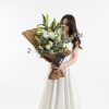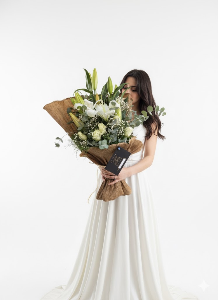 A stunning bouquet elegantly wrapped in kraft paper, carefully arranged with 3 lilies, eucalyptus, 5 white roses, and delicate filler flowers. Perfect for expressing love, appreciation, and heartfelt emotions.