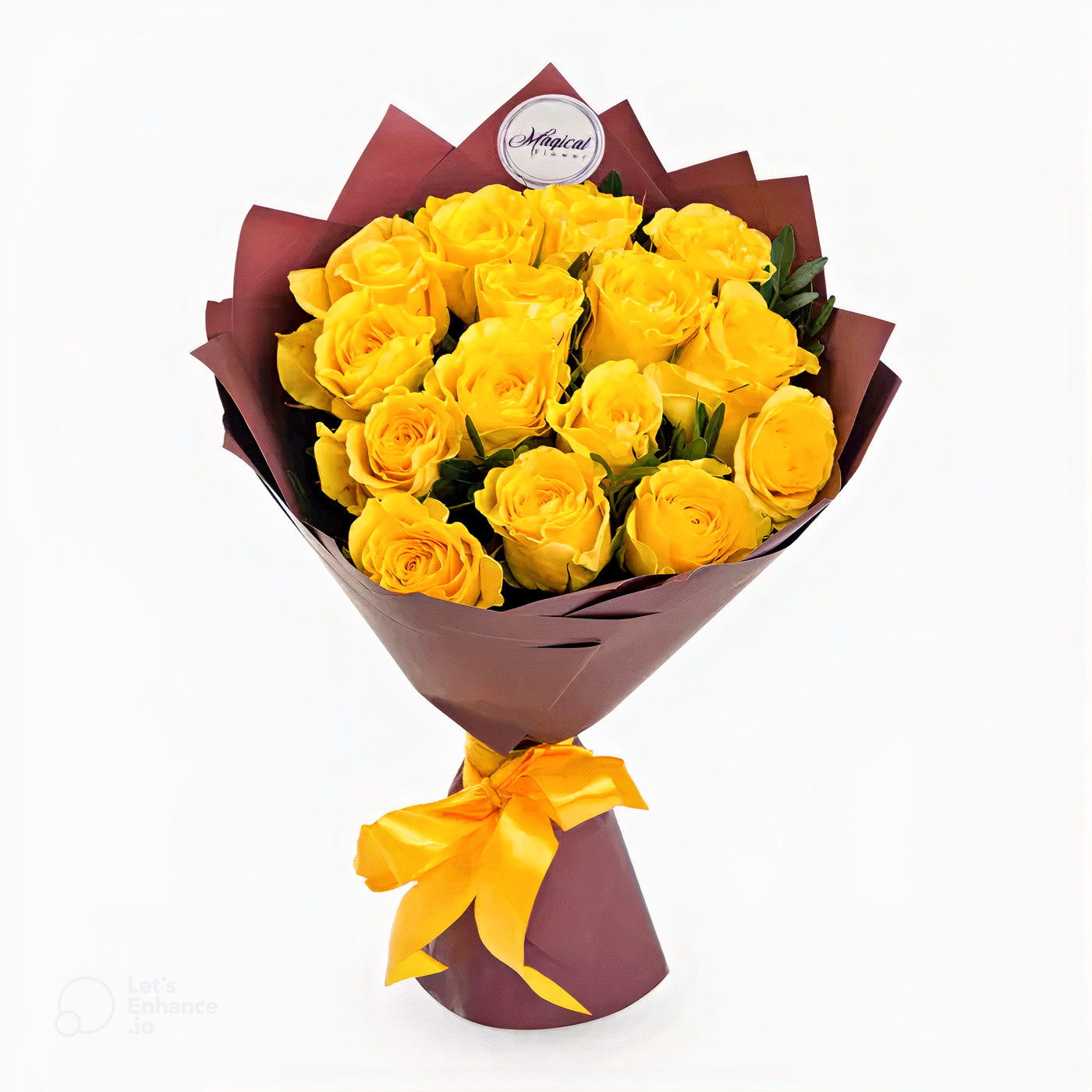 15 Yellow Roses, white wrapper and ribbon.